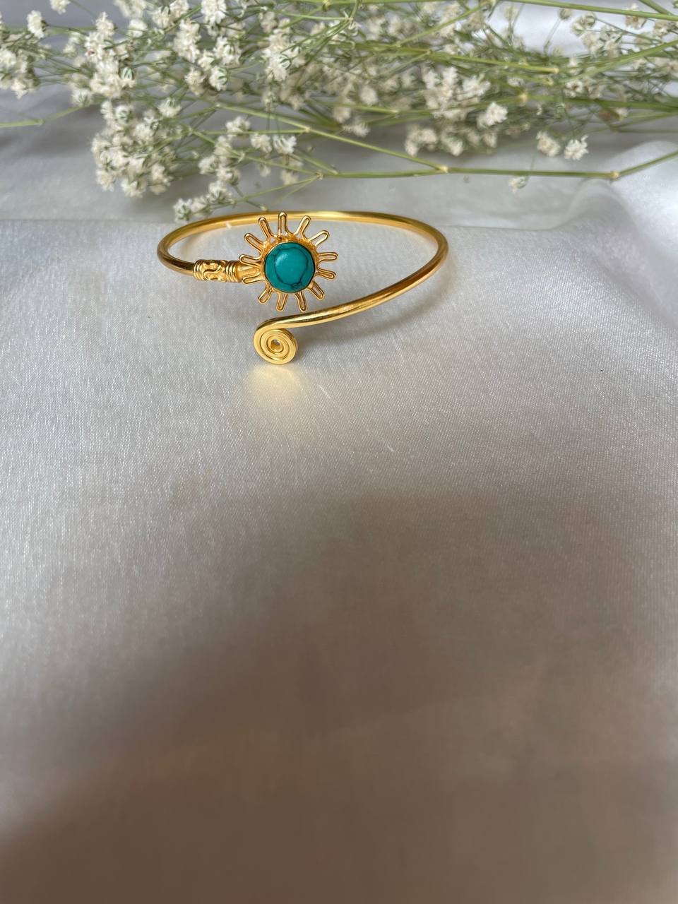 • Turquoise Tranquility: Brass bracelet with gold plating featuring a semi-precious Turquoise stone, radiating calming vibes and elegance.